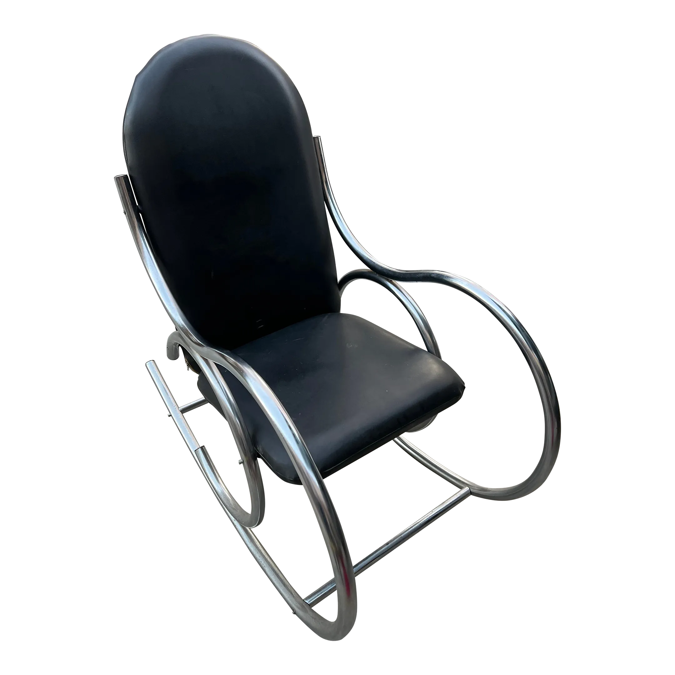 1970 s Bauhaus Style Black Faux Leather Chrome Bentwood Style Rocking Chair After Thonet Very well made.